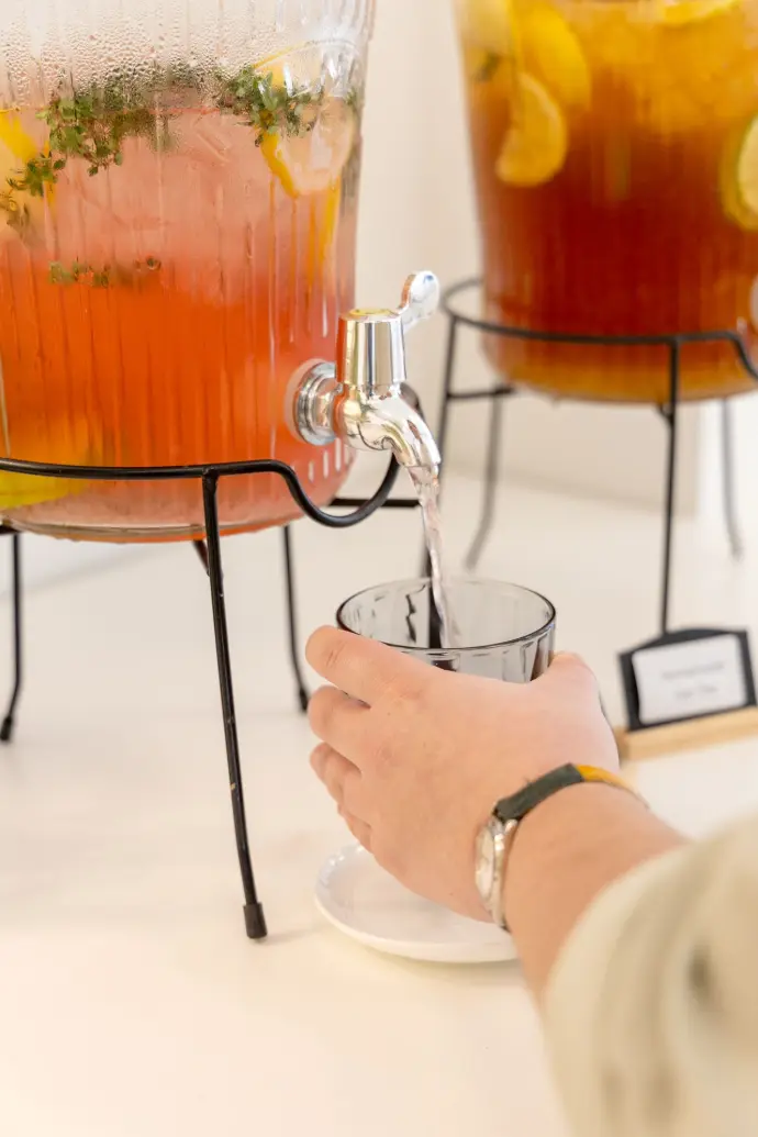 In onze feestzaal staan drankjars met huisgemaakte ice tea en limonades klaar, zodat uw gasten zich vrij kunnen bedienen van een verfrissend drankje.
