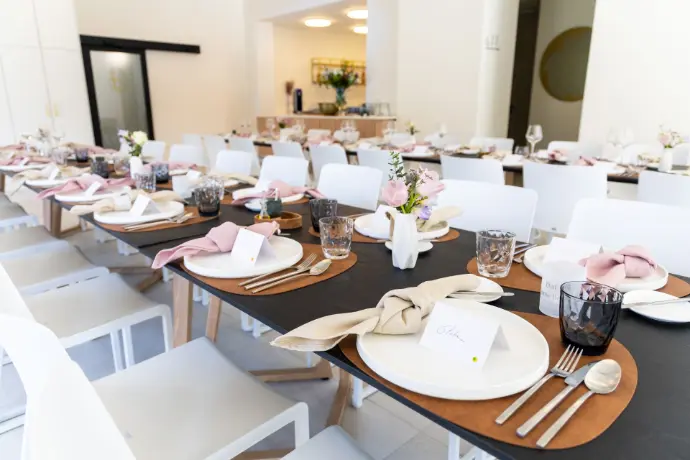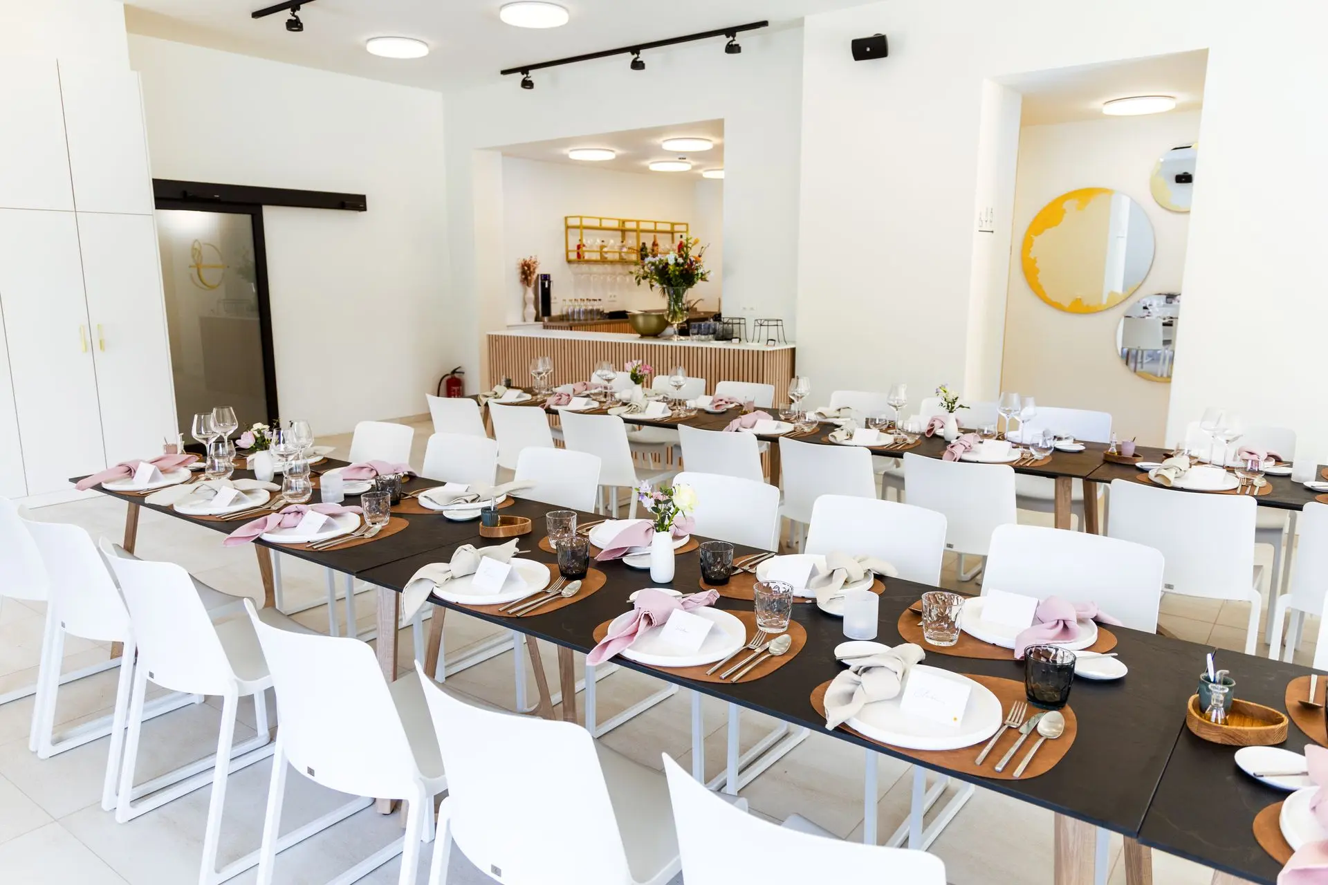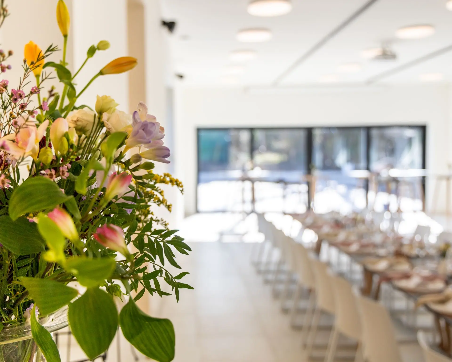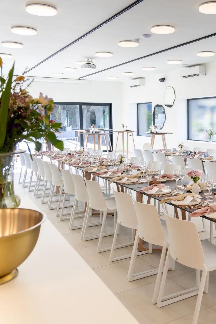 Onze lichtrijke zaal (100 m²) is met liefde voor detail ingericht, waar eenvoud siert en sfeer vanzelf ontstaat. De ruimte straalt rust en puurheid uit en biedt tegelijk alle vrijheid om met eigen decoratie en accenten een event volledig op maat te creëren.