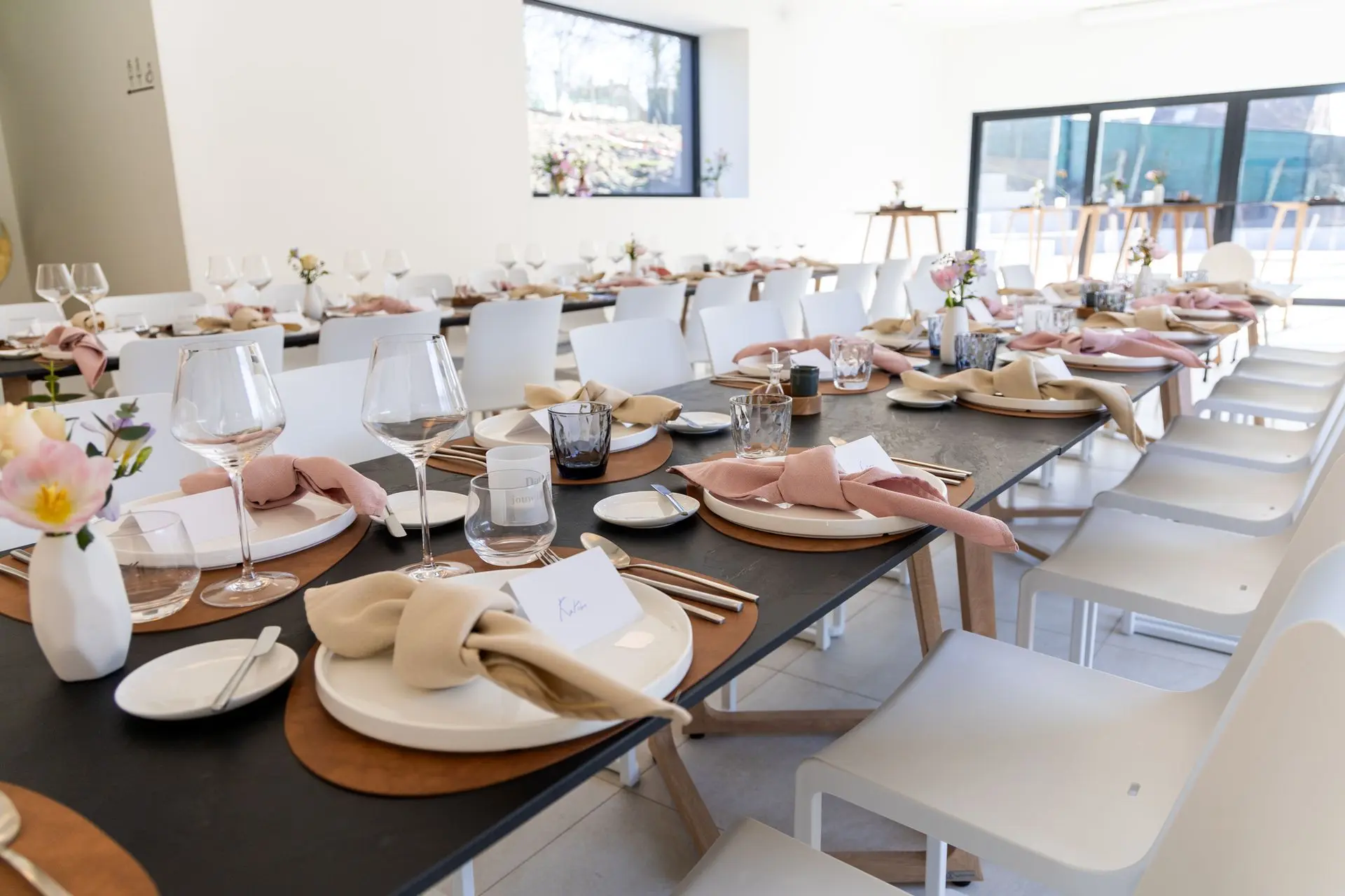 Onze feestzaal is lichtrijk & aangenaam geklimatiseerd, zodat het er in elk seizoen comfortabel vertoeven is. Grote raampartijen zorgen voor een open, warme sfeer overdag, terwijl het binnenklimaat altijd perfect afgestemd blijft, zomer én winter.
